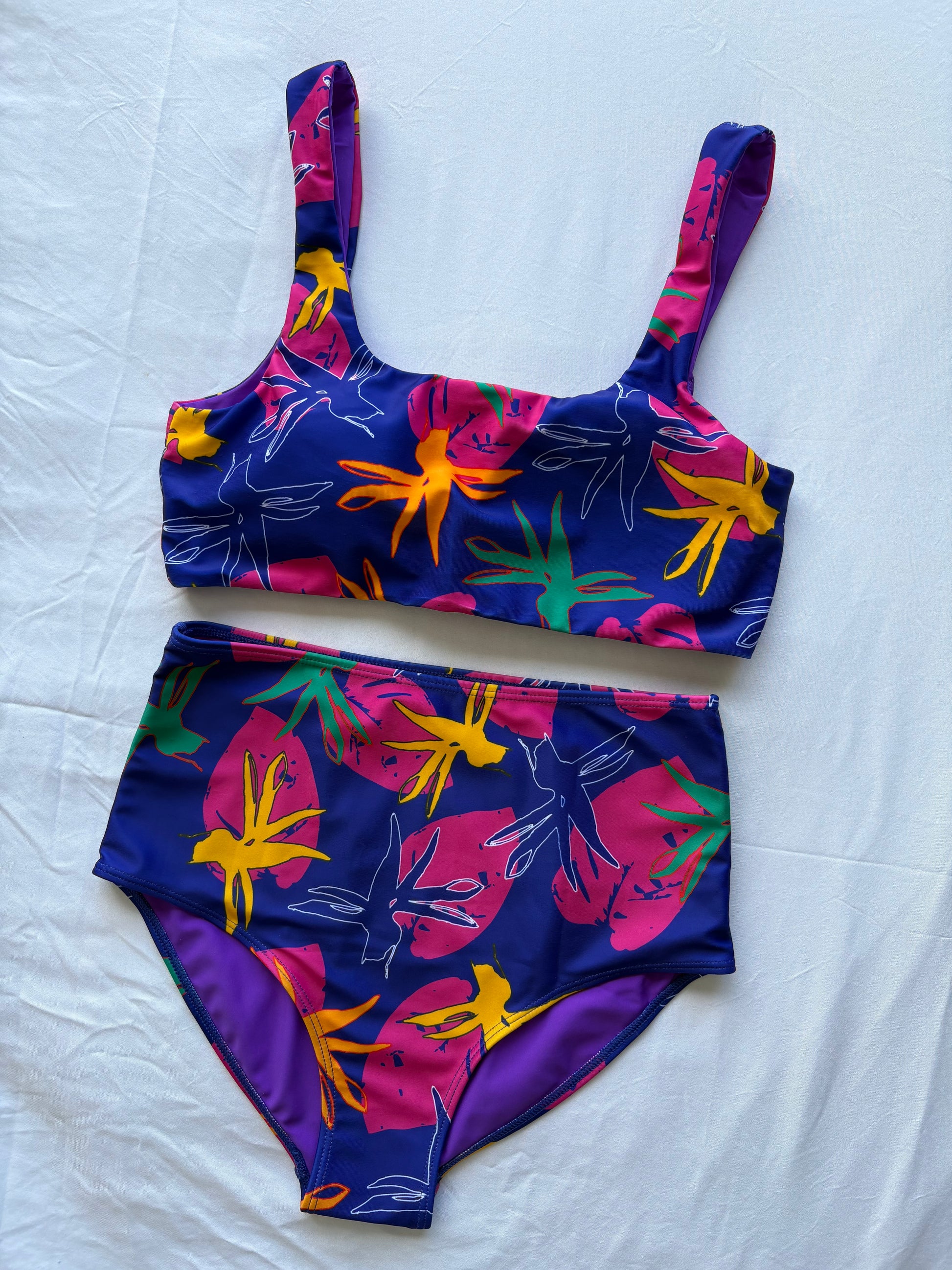 Adorned with a hand-drawn bird of paradise print in rich midnight hues, it’s perfect for making a splash while staying comfortable and confident.